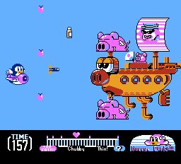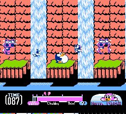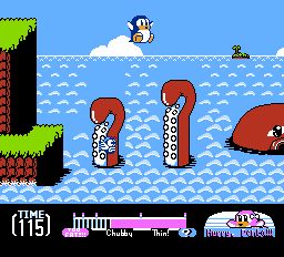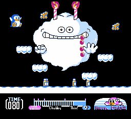 Existem algumas curiosidades em Yume Penguin Monogatari. Penta não tem barra de vida. Em vez disso, ele tem um medidor de condicionamento físico. O medidor é dividido em três categorias, cada uma dotando Penta de habilidades diferentes. Inicialmente ele é gordinho e tem um ataque de chute malvado. Coma muita comida e ele ficará obeso. Como você pode imaginar, quando o obeso Penta anda por aí e mal consegue pular. Mas, e não posso acreditar que estou dizendo isso, a obesidade tem seus benefícios, pois pode atacar inimigos com o corpo. Um Penta magro grita com os inimigos para derrotá-los e geralmente é mais ágil do que suas outras formas.