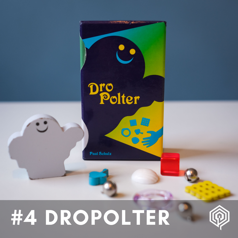 Se criássemos uma classificação boba para os jogos da nossa biblioteca, então DroPolter sem dúvida estaria perto do topo! Cada jogador começa o jogo com um punhado idêntico de cinco objetos táteis. A cada rodada, uma carta é virada mostrando alguns, mas não todos os objetos. O primeiro jogador a soltar apenas os objetos corretos de sua mão usando apenas essa mão e depois pegar o fantasma ganha um ponto! Infelizmente, o ponto vem na forma de um sininho, que também deve ser segurado na mesma mão dos objetos, e se você deixá-lo cair, você o perdeu! O primeiro jogador a cinco sinos vence. Um momento totalmente ridículo para 2 a 5 jogadores com mais de 6 anos.